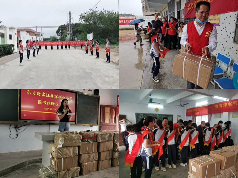 2022年5月27日,东方财富证券深圳分公司携手深圳市证券业协会,共赴深圳证监局帮扶的广东省陆丰市甲东镇岱头村开展捐书助学活动。此次活动,东方财富证券深圳分公司向岱头小学捐赠价值3万元图书1000余册,为孩子建起图书角、实现阅读梦贡献绵薄之力。