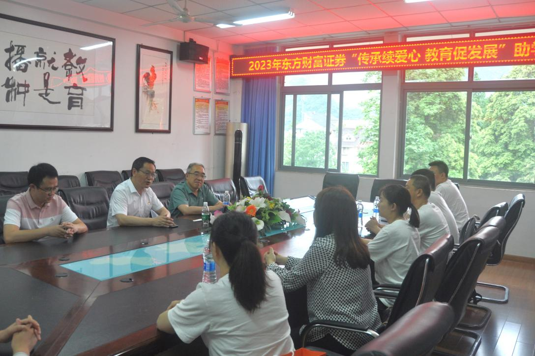 (东方财富证券慰问组与朱锦刚校长及教委领导进行亲切会谈)