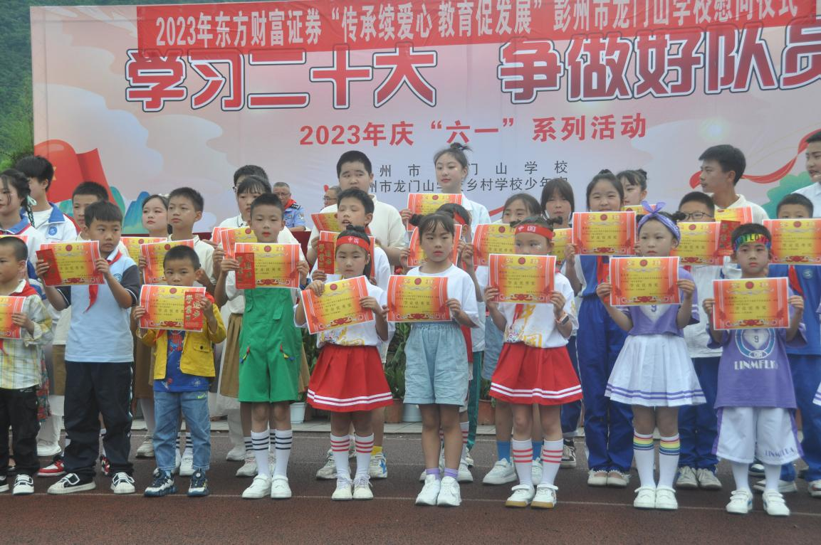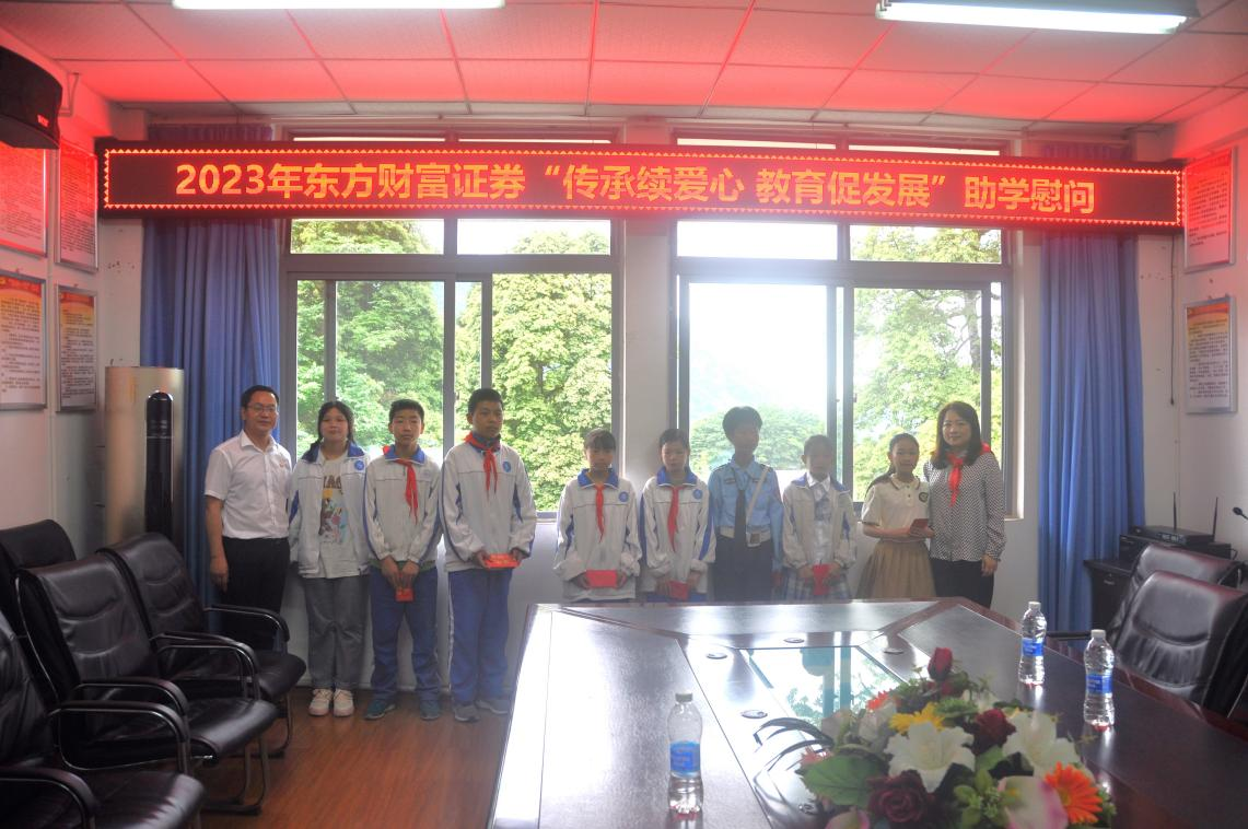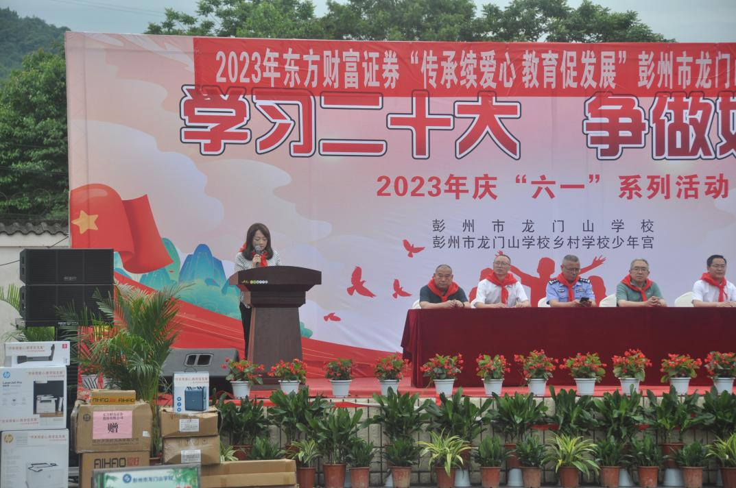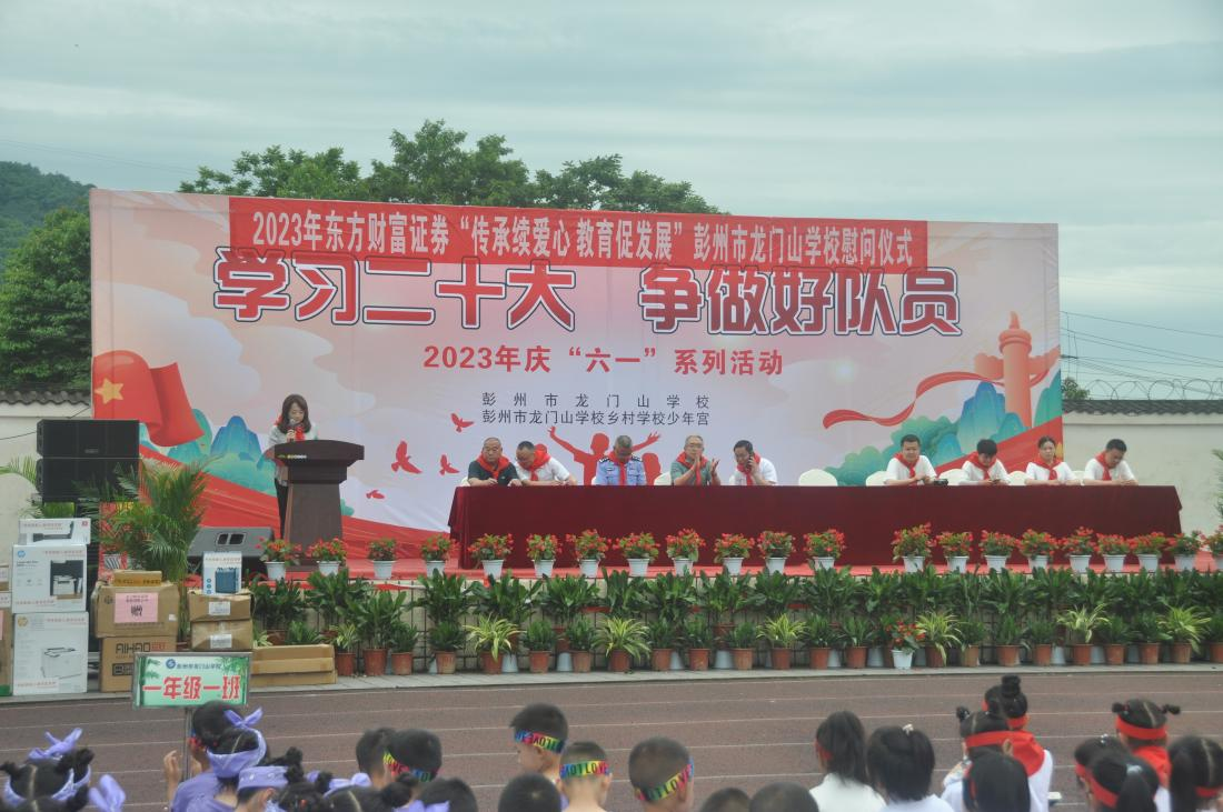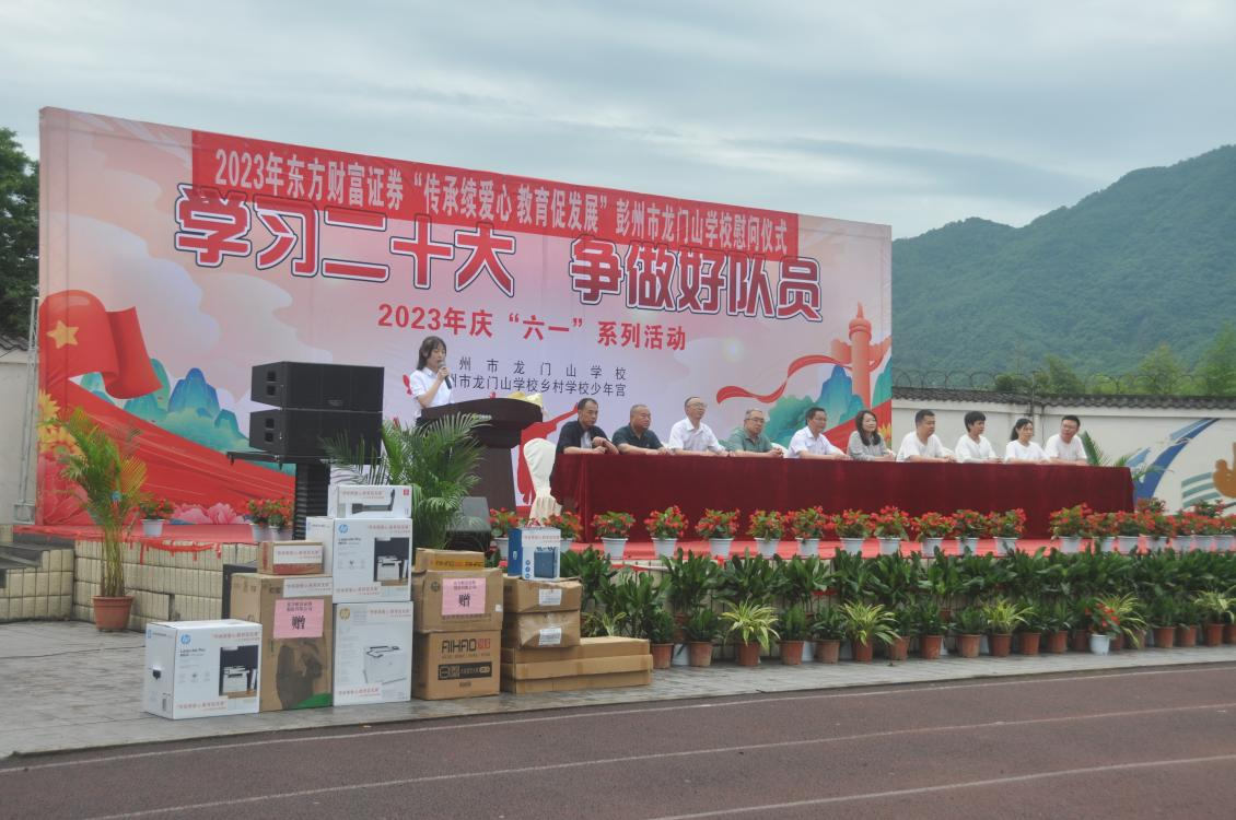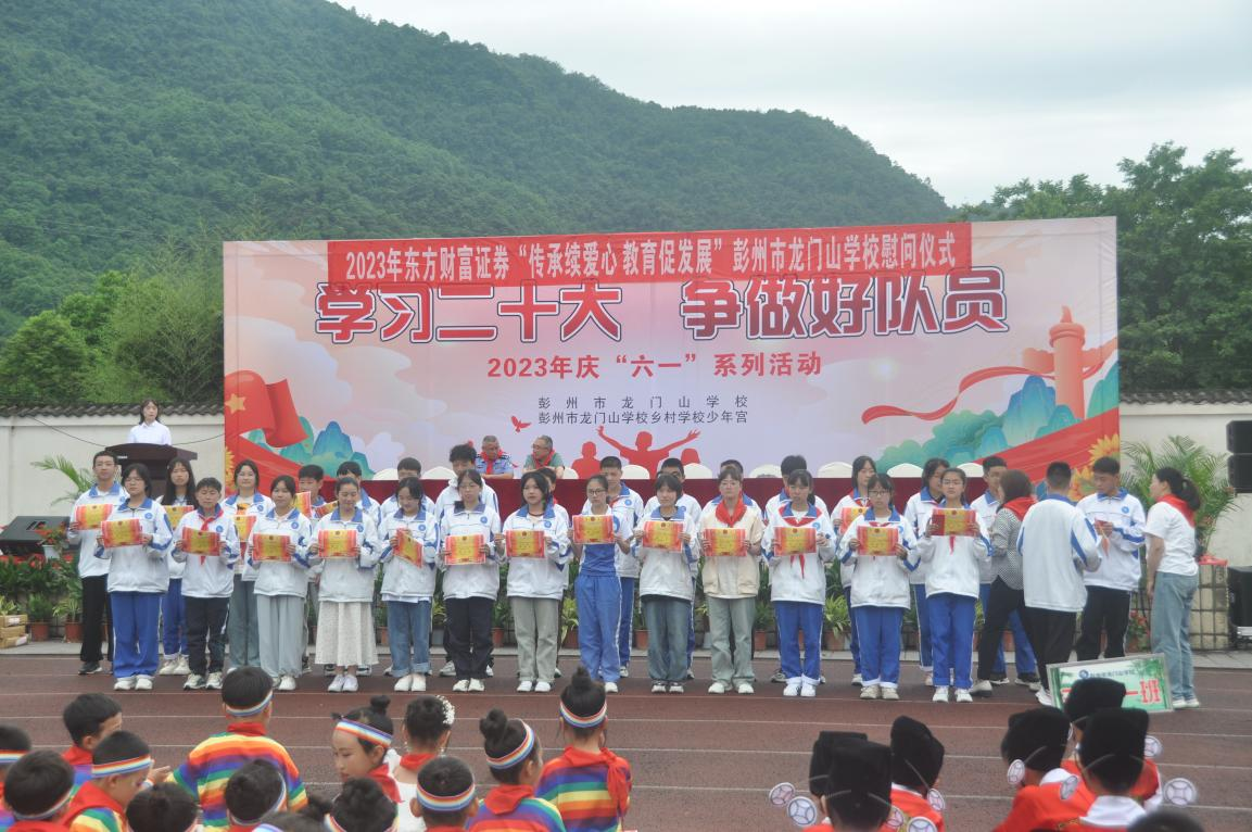 2023年6月1日,受东方财富证券党委及公司委托,成都分公司总经理沈燕带领辖区营业部负责人及党群代表一行8人组成慰问团,带着浓浓的情谊和慰问品再一次来到四川省彭州市龙门山学校,开展“传承续爱心·教育促发展”助学慰问及颁发奖学金活动。彭州市教育局有关领导以及龙门山学校近千名师生一同参加。