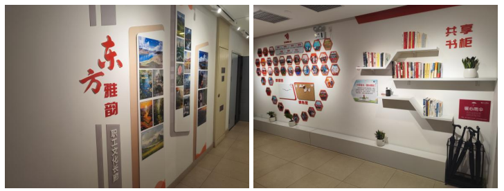 “职工文化长廊”集中展示了公司文化的多样性和员工的创造力。“东财公益”板块详尽展示了公司长期以来践行社会公益的七个板块“环保、教育、振兴、健康 慈善、服务、文化”;“微心愿与微留言”鼓励员工写下和认领微心愿、搭建公益内部交流平台;共享书柜的图书可供大家免费取阅,也欢迎小伙伴们把自己闲置的图书放到这个“图书漂流角”参与微公益,这里欢迎每一位热爱阅读、渴望成长、热爱公益的东财人到来。此处还放置了“暖心雨伞”,为访客及东财小伙伴雨天出行多了一份温暖与从容。