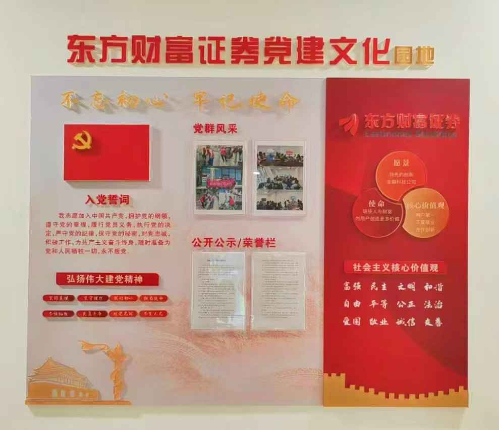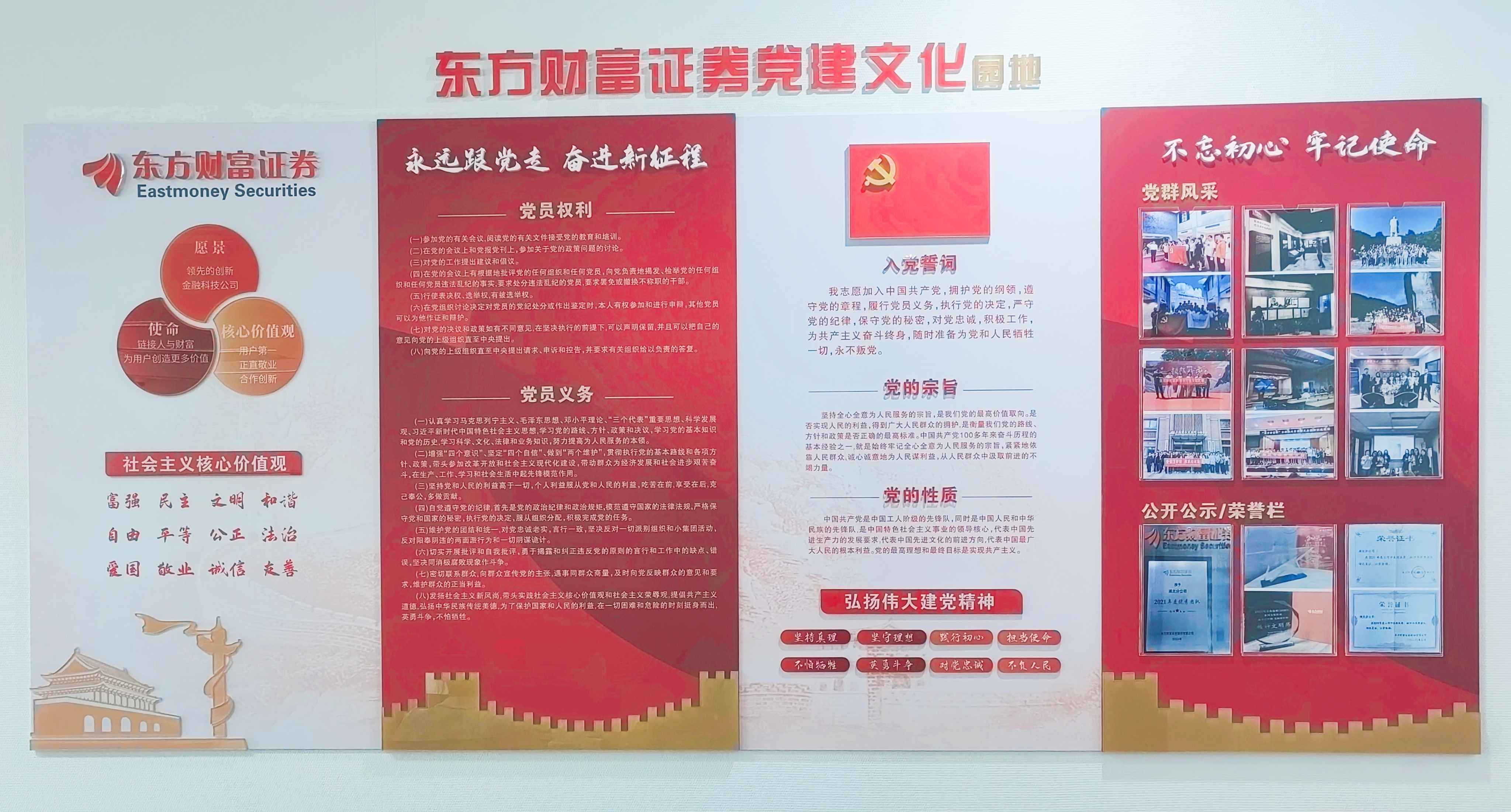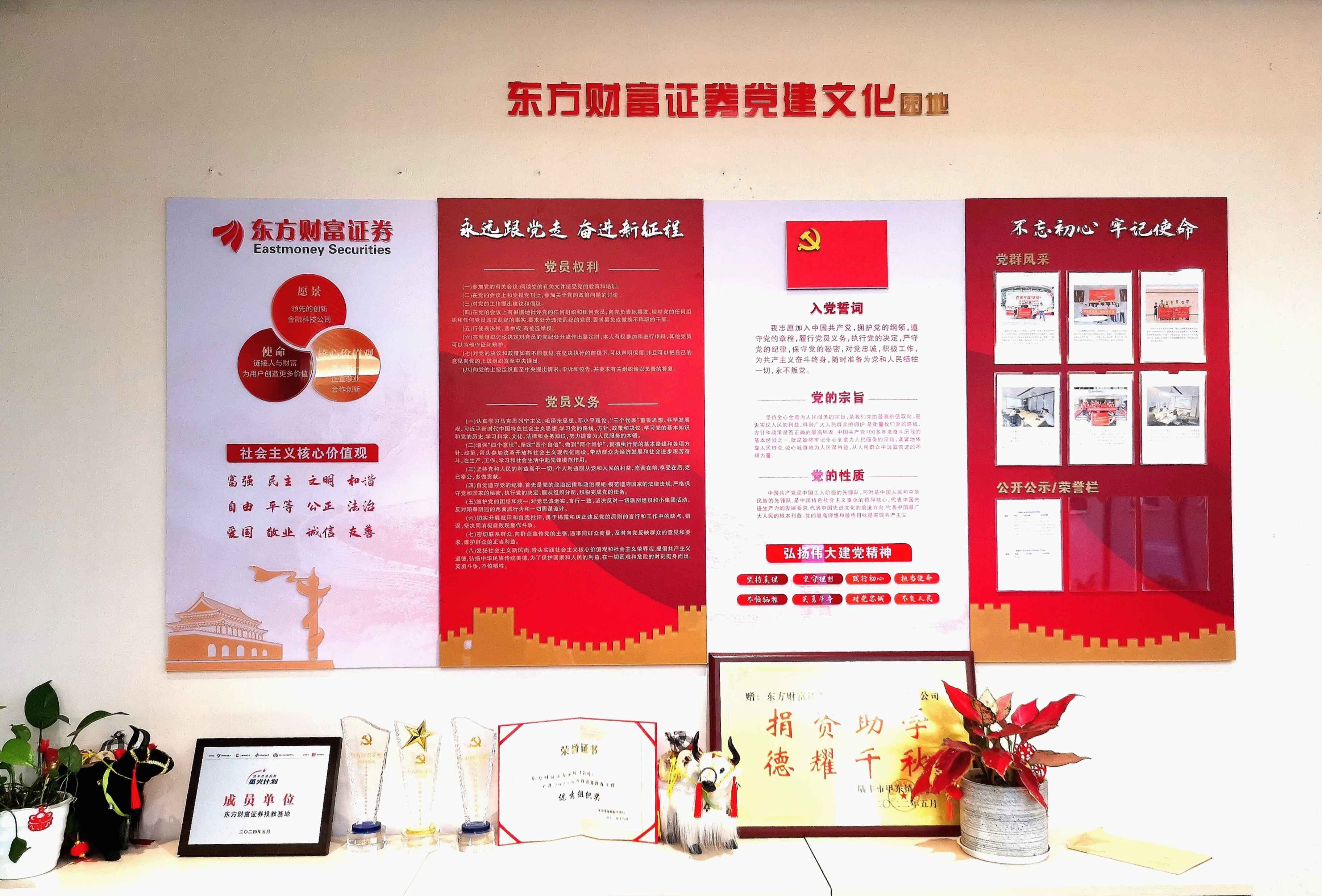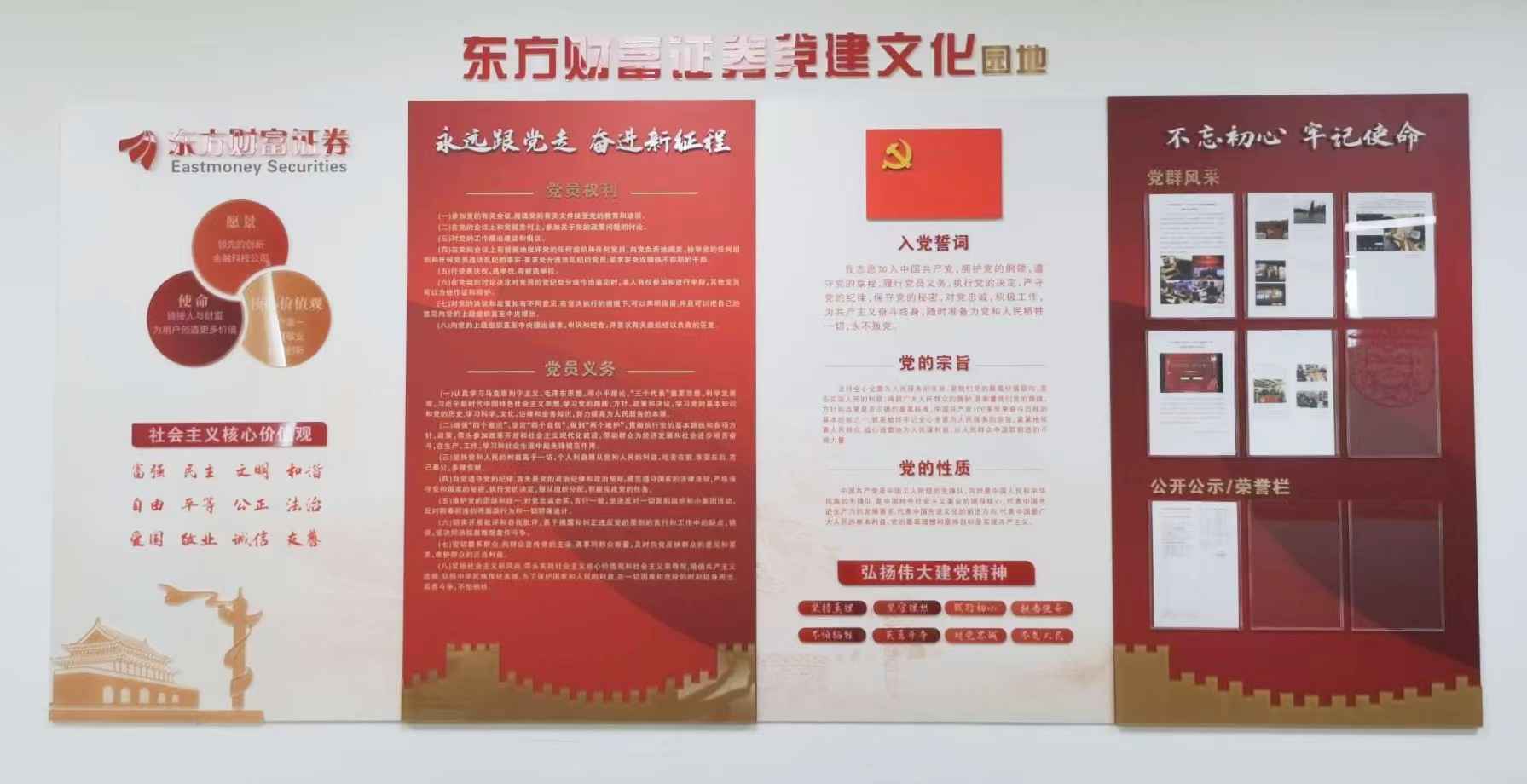 东方财富证券强化党建文化阵地建设,让闲置空间用起来、活起来,让党建和企业文化理念成为看得见、摸得着的显性化内容,彰显党建带工建、带青妇工作、带企业文化、带社会责任“五位一体”的民营企业党建品牌。内部凝聚共识,外部展示金融服务窗口良好形象,引领网点建设,促进高质量发展。