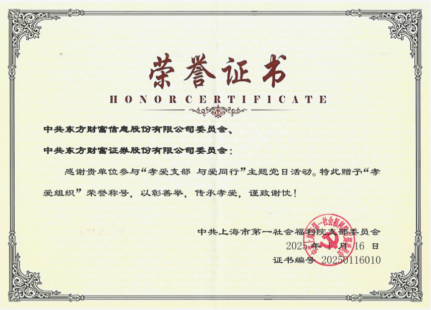 为感谢东方财富证券在参与“孝爱支部 与爱同行”主题党日活动中展现出的爱心和奉献精神,福利院特赠予公司党组织“孝爱组织”荣誉证书,以彰善举。活动结束后,全体志愿者还与老人们合影留念,记录下这美好的时刻。